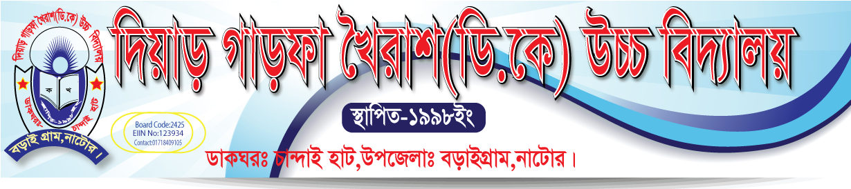 প্রধান শিক্ষকের বাণীঃ দিয়াড় গাড়ফা খৈরাশ (ডিকে) উচ্চ বিদ্যালয় আদশনিষ্ঠ ছাত্র-ছাত্রী তৈরি করে তার ঐতিহ্যকে গৌরবাম্বিত করে রেখেছে। আমাদের স্বপ্ন বিদ্যালয়টিকে একটি আদশ শিক্ষাপ্রতিষ্ঠানে পরিনত করা, যার মধ্য থেকে বেরিয়ে আসবে সৎ, নিষ্ঠাবান, দায়িত্বশীল, সুশৃংখল এবং কমমূখী জ্ঞানসমৃদ্ধ ছাত্র-ছাত্রী। এসব ছাত্র-ছাত্রী কমজীবনে প্রতিষ্ঠিত হয়ে যদি তাদের পরিবার, সমাজ, দেশ ও সবোপরি গণমানুষের কল্যাণে কিছু করতে পারে তবেই সাথক হবে আমাদের সব আয়োজন ও প্রয়াস। তথ্যই শক্তি” এই প্রতিপাদ্যকে সামনে রেখে এবং বতমান সরকারের ডিজিটাল বাংলাদেশ গড়ার স্বপ্নে তথ্য-প্রযুক্তির কোনো বিকল্প নেই। সুতরাং অবাত তথ্যপ্রবাহ সকলের জন্য উন্মুক্ত করার লক্ষ্যে খোলা হলো দিয়াড় গাড়ফা খৈরাশ (ডি.কে) উচ্চ বিদ্যালয়ের ডাইনামিক ওয়েব সাইট। এই ওয়েব সাইট ভিজিট করে আপনি বিদ্যালয়ের সকল ধরণের তথ্যাদি অনায়াসে জানতে পারবেন এবং প্রয়োজনে আপনার সুচিন্তিত মতামত জানাতে পারবেন। ফলে এর মাধ্যমে বিদ্যালয়ের সকল কাযক্রমে আরো স্বচ্ছতা, গতিশীলতা এমনকি জবাবদিহিতা নিশ্চিত করবে এবং সেবার মান আরো উন্নত হবে বলে আমি বিশ্বাস করি। আমি অভিভাবক, সমাজের সূধীজন ও সমাজসেবকসহ সরকারের সকল দপ্তর, অধিদপ্তর ও পরিদপ্তরের কমকতা/কমর্চারিগণকে দিয়াড় গাড়ফা খৈরাশ (ডিকে) উচ্চ বিদ্যালয়ের ওয়েব সাইট ভিজিট করার আমন্ত্রণ জানাচ্ছি। ধন্যবাদন্তে- মোছাঃ শাহনাজ পারভীন প্রধান শিক্ষক/সম্পাদক দিয়াড় গাড়ফা খৈরাশ (ডিকে) উচ্চ বিদ্যালয় বড়াইগ্রাম,নাটোর।